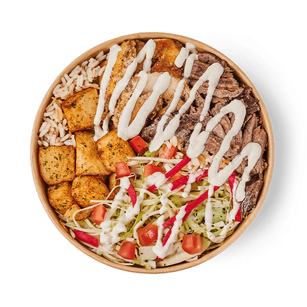 Tender shawarma meat served over a bed of fluffy rice, topped with fresh vegetables and finished with our signature sauces for a perfectly balanced bowl.